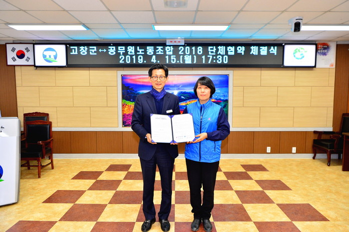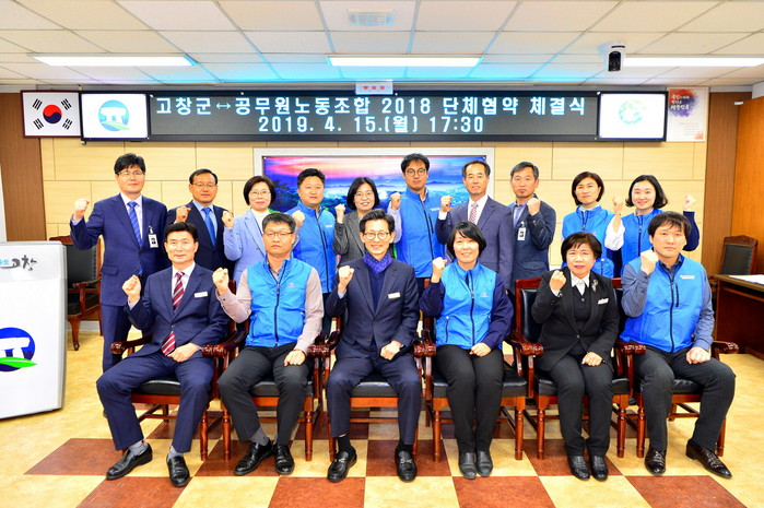 단체협약 체결식은 지난 15일 오후 군청 2층 상황실에서 유기상 고창군수, 안남귀 노조위원장 등 노사 양측 본교섭 위원 18명이 참석한 가운데 경과보고, 노사대표 인사말씀, 단체협약서 서명, 기념촬영 순으로 진행됐다.
