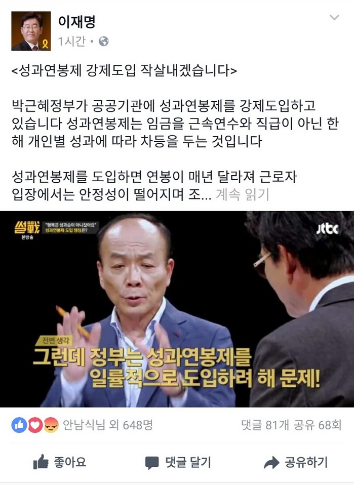 이 시장은 이날 페이스북에 올린 `성과연봉제 강제도입 작살내겠습니다`라는 제목의 글에서 “성과연봉제는 근로자 지위에 중대한 영향(불이익변경금지 원칙)을 미치기 때문에 노사합의에 따라 도입 여부를 결정해야 한다”며 공공기관과 금융권의 “성과연봉제 강제도입” 반대를 분명히 했다.
