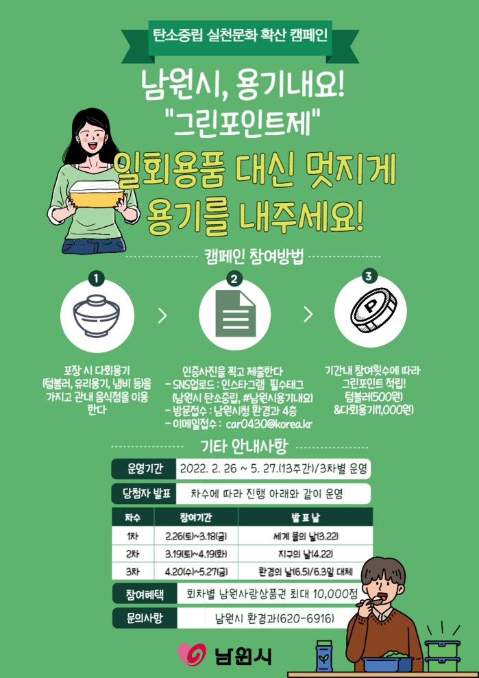 이번 캠페인은 관내 음식점에서 음료 및 음식을 포장할 때 일회용품 대신 다회용기(텀블러, 유리용기, 냄비 등)를 사용함에 따라 그린 포인트를 적립해주고 추후 누적 된 포인트를 남원사랑상품권 인센티브로 지급할 예정이다.