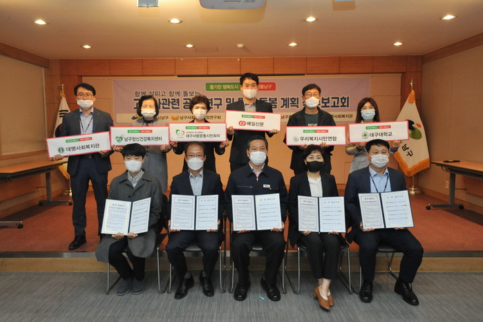 이번 착수보고회에서 남구청, 남구정신건강복지센터, 남구종합사회복지관, 대명사회복지관 등 5개 기관이 고독사 관련 공동연구와 통합돌봄계획에 대해 업무협약을 체결했다.