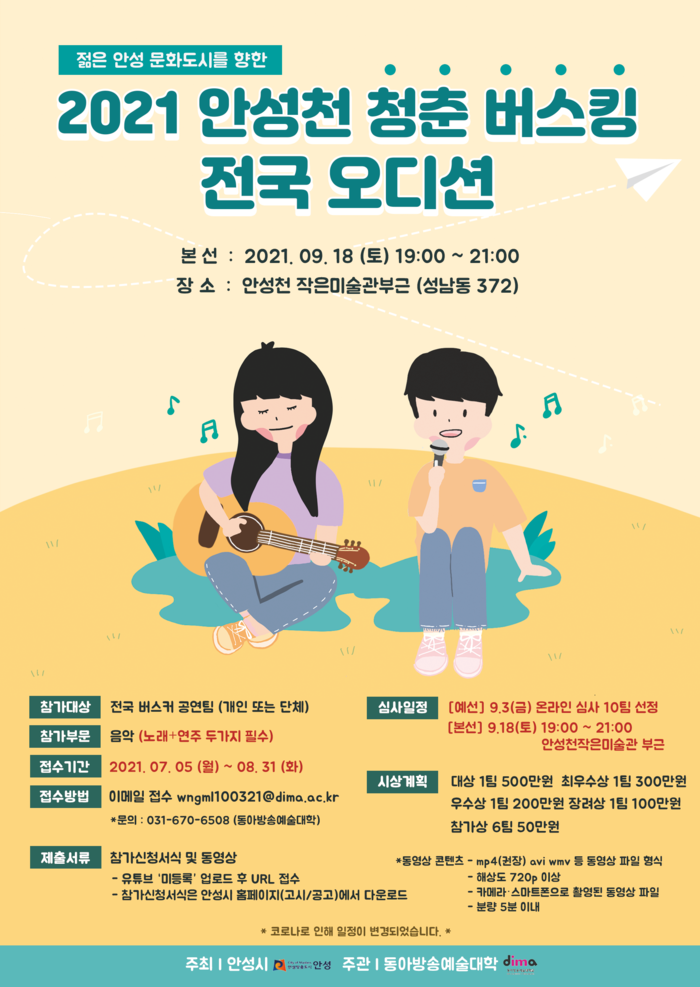 [로컬세계 김병민 기자]경기 안성시(시장 김보라)는 ‘2021 안성천 청춘버스킹 전국 오디션’ 본선 개최일을 오는 9월 18일로 연기했다고 19일 밝혔다.