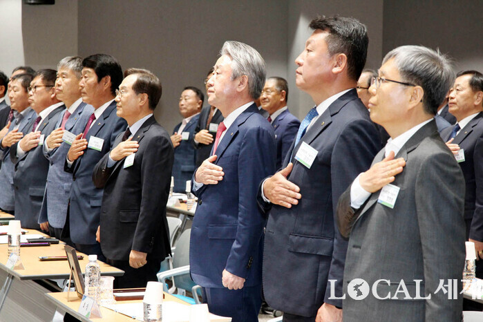 ▲서울농협은 14일 농협중앙회 서울본부 2층 대강당에서 강호동 농협중앙회장, 서울·산지농협 조합장 등 100여명이 참석한 가운데『새로운 대한민국 농협 도농상생 협약식』을 개최했다. 농협중앙회 강호동 회장, 김상수 서울지역본부장 등 참석조합장들이 국민의례를 하고 있다. |