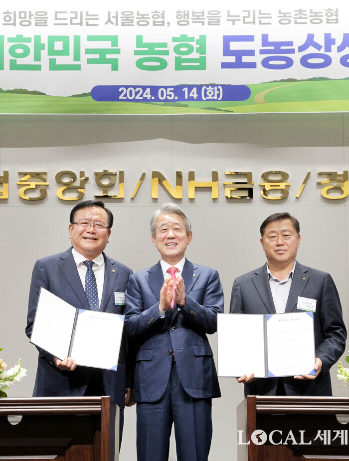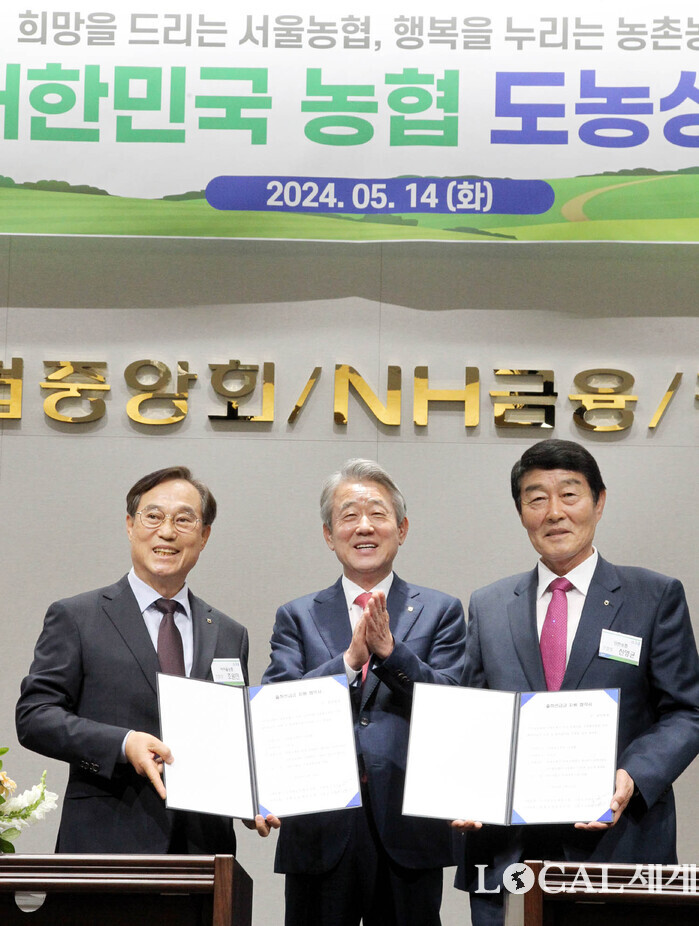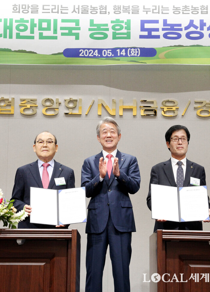 ▲서울농협은 14일 농협중앙회 서울본부 2층 대강당에서 강호동 농협중앙회장, 서울·산지농협 조합장 등 100여명이 참석한 가운데『새로운 대한민국 농협 도농상생 협약식』을 개최했다. (왼쪽부터) 남서울농협 안용승 조합장, 농협중앙회 강호동 회장, 세종대왕농협 이명호 조합장이 협약을 마치고 기념촬영을 하고 있다. |
