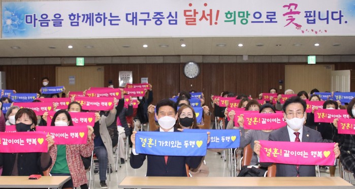 [로컬세계 박세환 기자]대구 달서구는 지난달 22일 달서구청 2층 대강당에서 결혼 적령기 자녀를 둔 부모들 99명이 참여한 가운데 결혼 공감토크인 ‘자녀결혼 이해하기’를 개최했다고 7일 밝혔다.