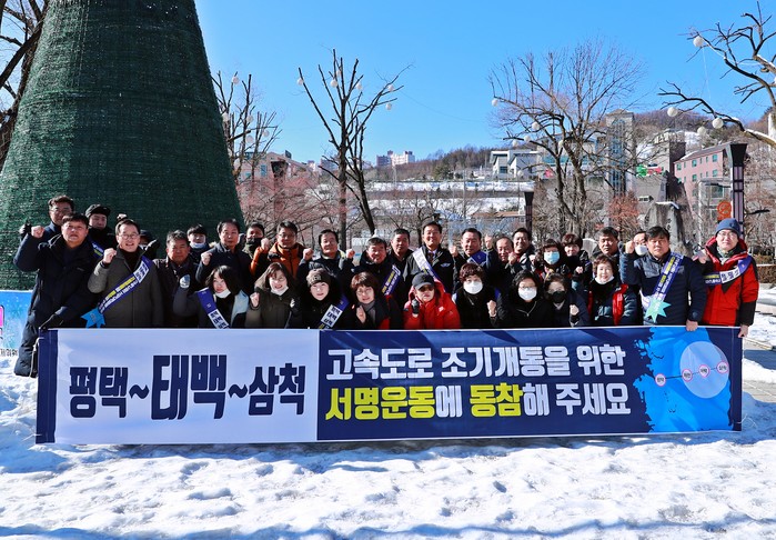 [로컬세계 박상진 기자]강원 태백시 번영회(회장 전영수)는 5일 황지연못 공원과 통리장에서 평택~태백~삼척 간 동서6축 고속도로 조기개통 촉구를 위해 가두 서명운동을 전개했다.