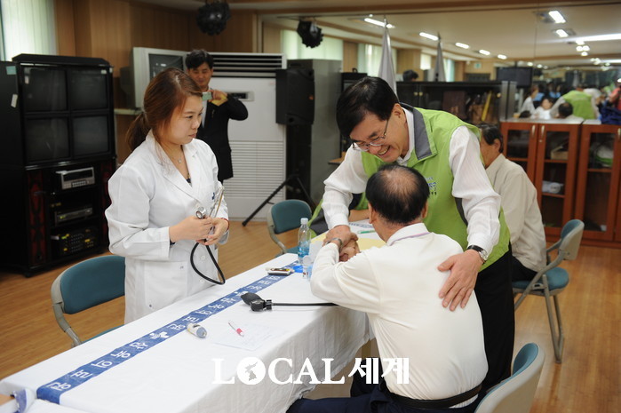 ▲ 유덕열 동대문구청장(오른쪽)이 저소득층 의료비지원 대상자에게 의료봉사를 펼치고 있다. © 로컬세계 |