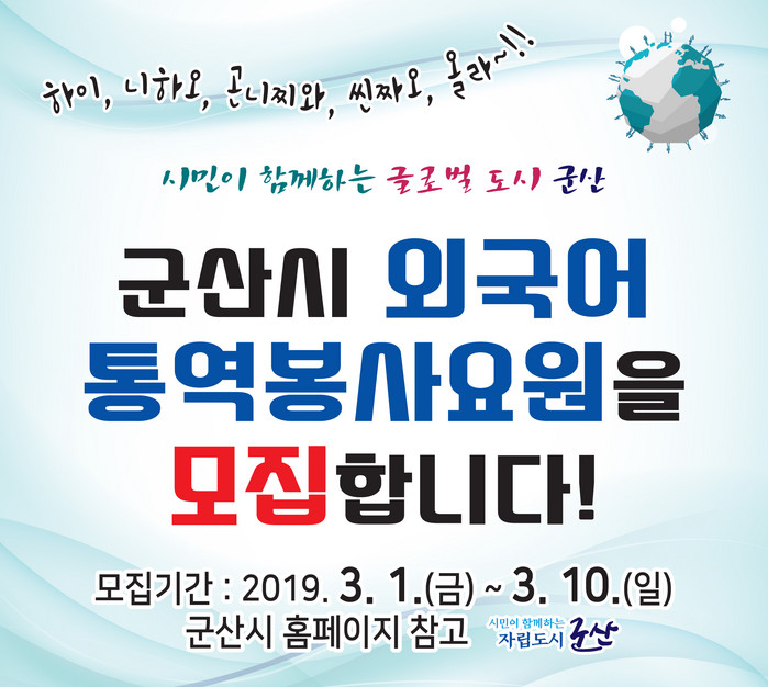 이번 통역봉사 모집에 관심 있는 사람은 3월 10일까지 군산시청 홈페이지를 참고해 시 기획예산과(☎454-2624)로 제출하면 된다.