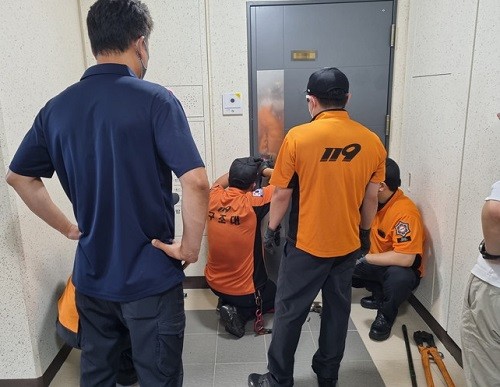 ▲부산경찰청 반부패경제범죄수사대가 119구조대에 협조를 요청, 불법 대부업체 사무실의 문을 강제로 개방하고 있다. 부산경찰청 제공 |