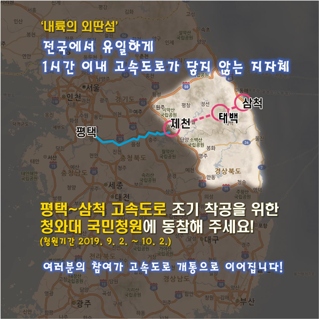 [로컬세계 박상진 기자]강원 태백시 번영회(회장 전영수)는 오는 9월 20일 오후 2시부터 태백 황지연못 공원에서 번영회 회원들과 함께 ‘평택~삼척 동서고속도로 조기 착공을 위한 청와대 국민청원 홍보 캠페인’을 실시한다.(사진=태백시 제공)