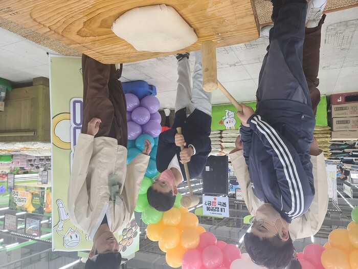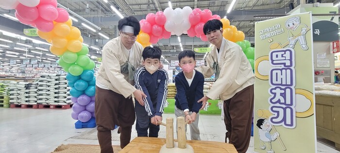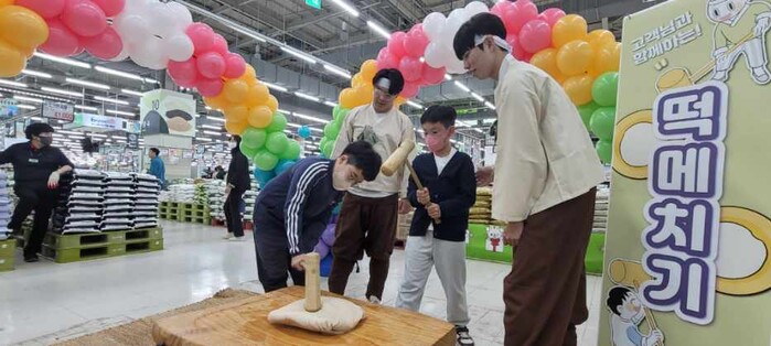 ▲ 4월 30일 경기도 고양시 소재 농협고양유통센터에서 열린 떡메치기 행사장에서 고객들이 떡메치기 체험을 하고 있다. 농협유통 제공 |