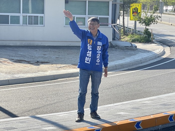 ▲양성빈 장수군수 예비후보가 중앙당 재심위원회가 "휴대폰 대리투표" 인용 결정으로 장수군민들에게 환한 미소를 띠며 선거운동에 돌입했다. 장수군은 최훈식 후보와 양성빈 후보가 재경선을 실시하기로 결정됐다. 재경선은 100% 권리당원 투표로만 실시된다고 밝혔다. 양성빈 예비후보 제공 |