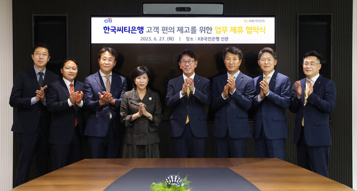 27일 서울시 영등포구 KB국민은행 신관에서 열린 협약식에는 이재근 KB국민은행 은행장, 유명순 한국씨티은행 은행장 및 양측 관계자들이 참석했다.