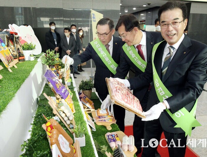 ▲ 이성희 농협중앙회장(오른쪽부터) 안병우 축산경제대표이사, 우성태 농업경제대표이사가 3일 삼겹살데이 20주년을 맞아 서울 중구 농협 본관에서 농·축산물 소비활성화를 위해 개최한 '삼(삼겹살)삼(인삼)한 우리 농축산물과 함께하는 행복한 삶' 캠페인에 참여해 축산 전시장을 순람하고 있다. |