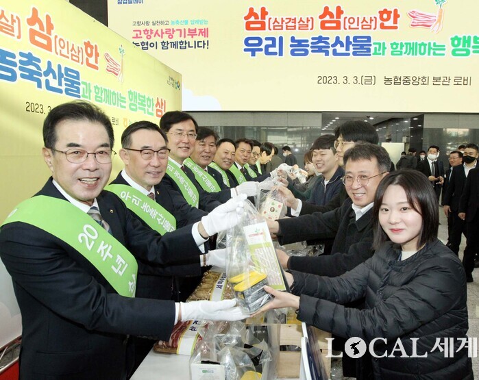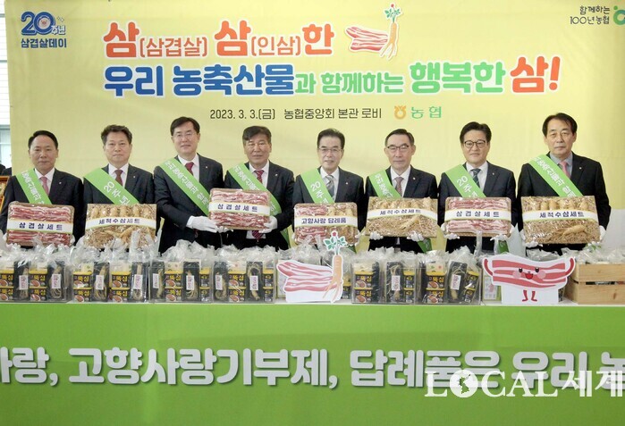 농협(회장 이성희)은 3일 삼겹살데이를 맞아 서울시 중구 농협중앙회 본관에서 삼겹살데이 20주년을 맞이해 농·축산물 소비활성화를 위해 ‘삼(삼겹살)삼(인삼)한 우리 농축산물과 함께하는 행복한 삶’ 캠페인을 펼치고 나눔 행사를 가졌다.