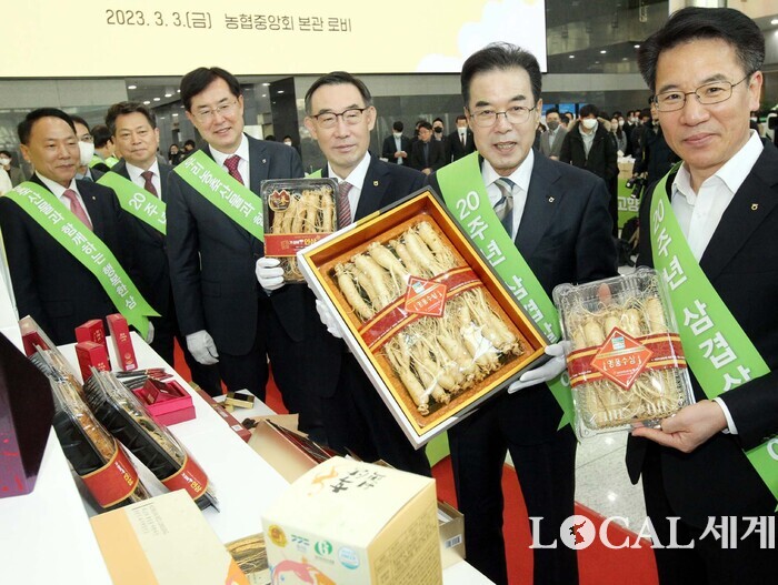 ▲ 이성희 농협중앙회장(오른쪽두번째) 및 임직원들이 3일 삼겹살데이 20주년을 맞아 서울 중구 농협 본관에서 농·축산물 소비활성화를 위해 개최한 '삼(삼겹살)삼(인삼)한 우리 농축산물과 함께하는 행복한 삶' 캠페인에 참여해 인삼 전시장을 순람하고 있다.(오른쪽 두 번째부터) 이성희 농협중앙회장, 우성태 농업경제대표이사, 안병우 축산경제대표이사, 조소행 상호금융대표이사, 박태선 조합감사위원장 |