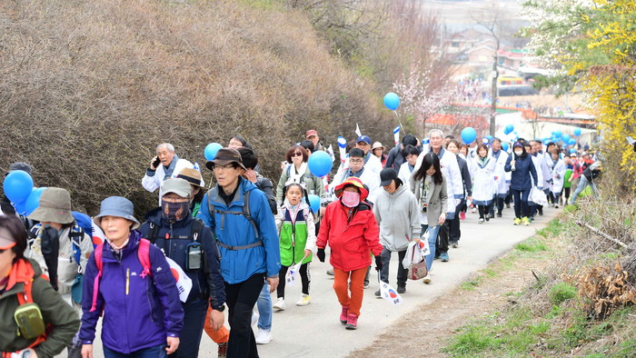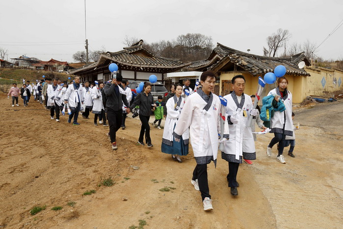 총 450여 명의 참가자들은 좁은 농로를 따라 3.8km, 한 시간가량을 걸어 1919년 4월 3일, 만세운동을 이끌었던 독립운동가 차희식 선생의 집터에 도착했다.