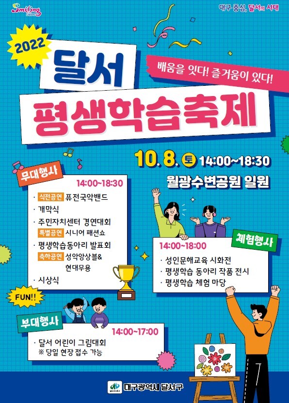 달서구는 코로나19로 침체되었던 평생학습동아리, 희망학습마을, 동 주민자치센터 등 평생학습활동을 새롭게 시작해 보자는 의미를 담아 ‘2022 달서평생학습축제’를 준비했다.