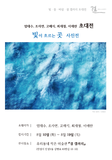[로컬세계 김병민 기자]경기 안성시는 오는 19일까지 안성천에 조성된 우리동네 작은미술관 ‘결 갤러리’에서 ‘빛이 흐르는 곳’ 이란 주제로 엄태수, 조자연, 고배식, 최대철, 이애란 등 5인의 중견 사진작가의 작품 기획전시를 운영한다고 17일 밝혔다.