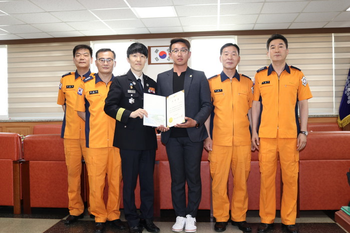 [로컬세계 맹화찬 기자]부산 북부소방서(서장 류승훈)는 지난 20일 오후 2시 북부소방서장실에서 낙동강에 빠진 승용차를 목격하고 일가족 3명을 구한 김준태씨(남, 32세)에게 서장 표창을 수여했다.