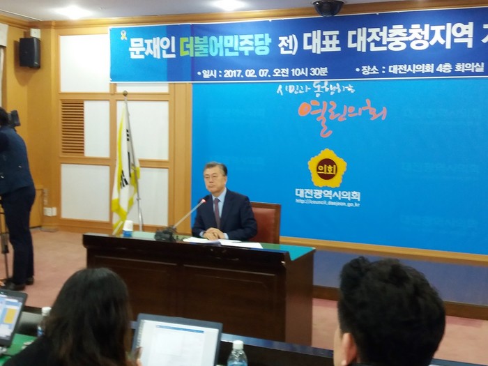 문 전 대표는 7일 대전시의회 대회의실에서 대전충청지역 기자간담회를 열고 “충청지역에서 정권교체를 좌우할 것 것으로 본다. 그러므로 충청지역에서 더 많은 지지를 받고 더 많이 사랑 받아서 반드시 정권교체의 주역이 되고 싶다”고 강조했다.