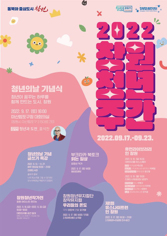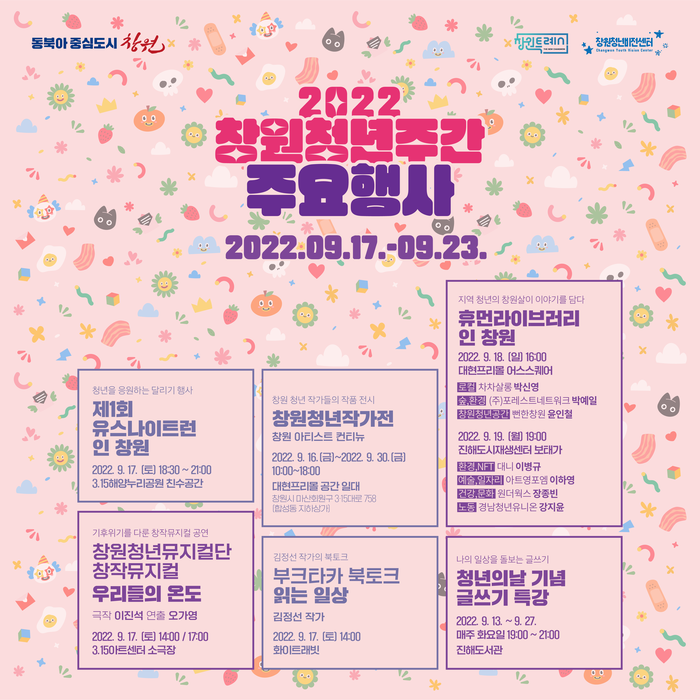 또한, 17일부터 23일까지 청년주간에는 ‘유스나이트런 인 창원’, ‘청년창작뮤지컬 공연’, ‘창원청년작가 전시전’, ‘부크타카 북토크’, ‘휴먼라이브러리 인 창원’, ‘글쓰기 특강’ 행사가 진행되며 자세한 내용은 창원청년비전센터 홈페이지에서 확인할 수 있다.