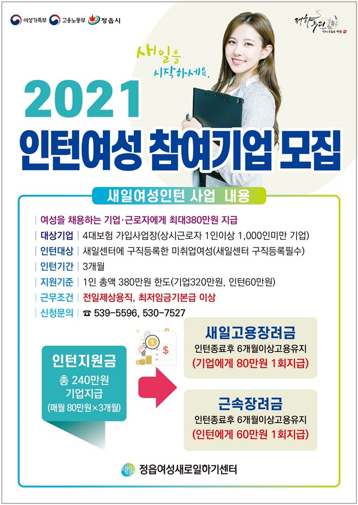 인턴 참여를 희망하는 기업 또는 구직여성은 정읍여성새로일하기센터로 문의하면 된다.
