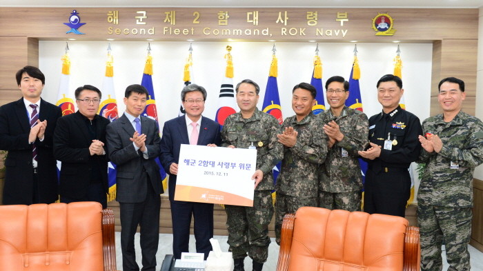 | ▲채인석 화성시장(왼쪽 네 번째)이 해군 2함대사령부를 방문해 위문품을 전달하고 있다. |