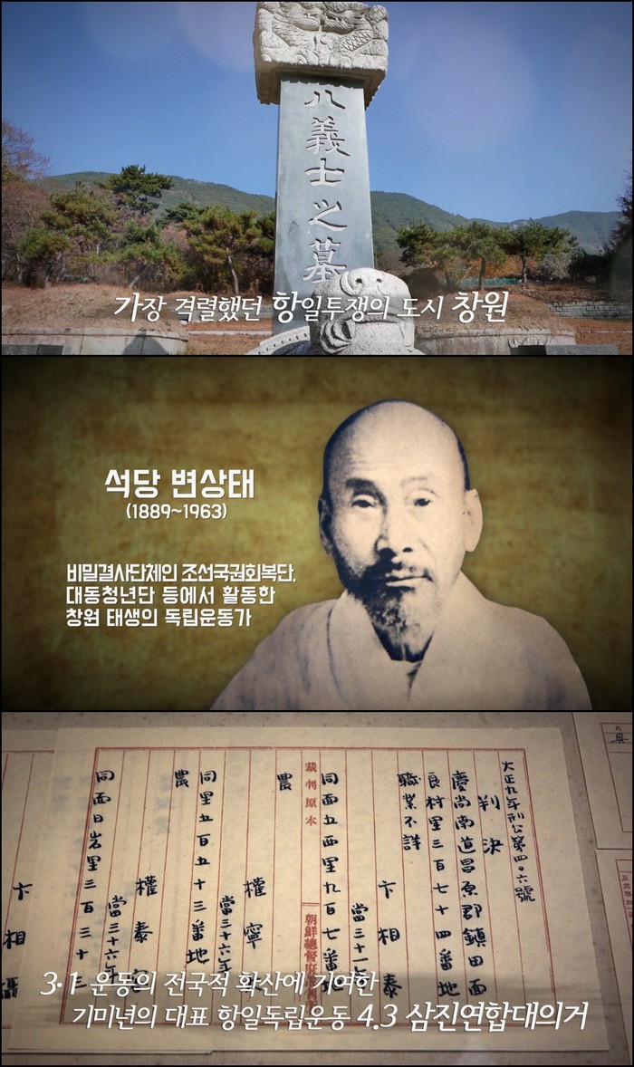 첫 번째 영상은 기미년의 가장 격렬했던 만세운동 중 하나로 꼽히는 4‧3삼진연합대의거의 정신과 전개과정, 결과, 시위를 주도했던 석당 변상태 선생의 이야기다. 두 번째 영상에는 우리나라 최초의 계획도시 진해의 탄생 배경과 함께 진해지역에 남아있는 일제강점기 건축물, 김구선생 친필시비 등 근대문화유산 이야기가 담겨있다.