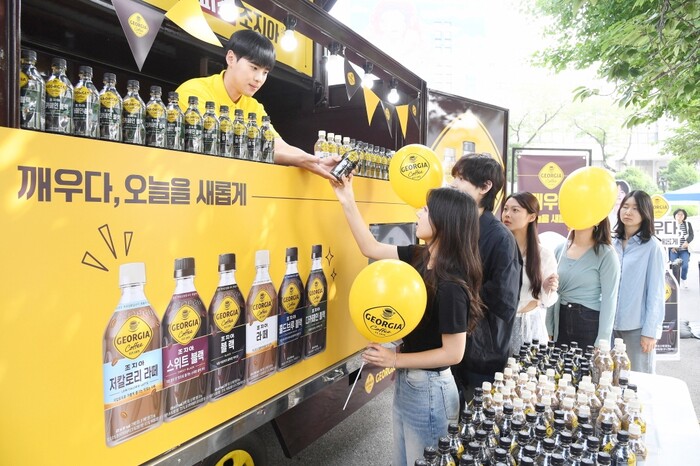 22일 서울 동대문구 경희대학교 캠퍼스에서 진행된 ‘코카-콜라사의 대표 RTD(Ready-To-Drink) 커피 브랜드 ‘조지아’의 ‘스쿨 페스티벌 어택(School Festival Attack)’ 참가자들이 조지아 커피를 받아가고 있다. 조지아는 경희대학교 축제 기간인 22일부터 24일까지 캠퍼스에 커피 트럭을 설치하고, ▲조지아 블랙 ▲조지아 라떼 ▲조지아 디카페인 제품을 제공하는 이벤트를 진행한다.