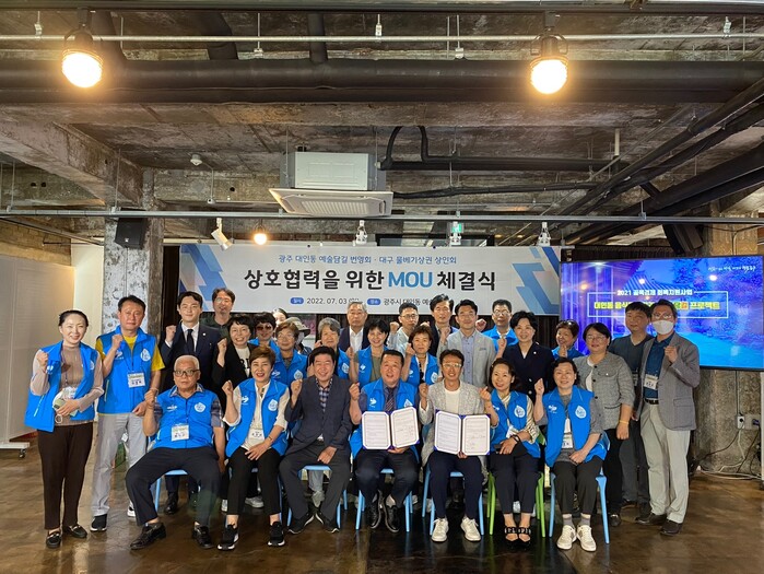 이날 협약식은 광주 대인동 예술담길 상인회관에서 이루어졌으며 남구 물베기 상인회(회장 유병선), 남구청 시장경제과 과장(이승원), 광주 대인동 예술담길 번영회(회장 이양섭) 및 동구청 도시재생과 등 관계자 40여 명이 참석했다.