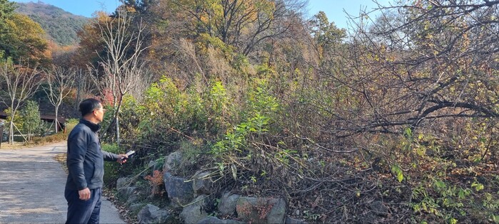 ▲ 팔룡공원 밤골여울마당 주차장 조성사업을 위한 현장 점검을 하고 있다. 창원특례시 제공 |