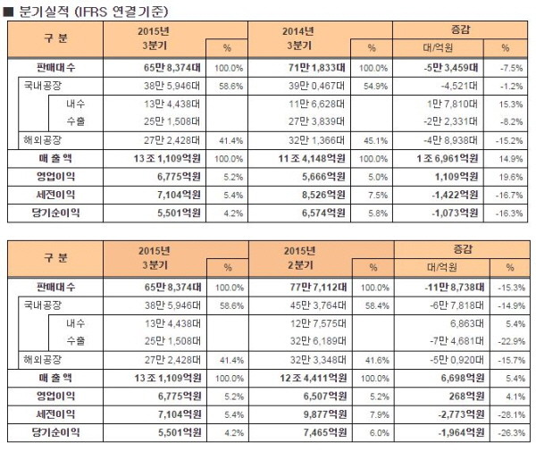오늘 발표에서 기아차는 지난 7~9월 3분기 동안 매출액 13조 1109억 원, 영업이익 6775억원, 세전이익 7104억 원, 당기순이익 5501억 원을 기록했다고 밝혔다.