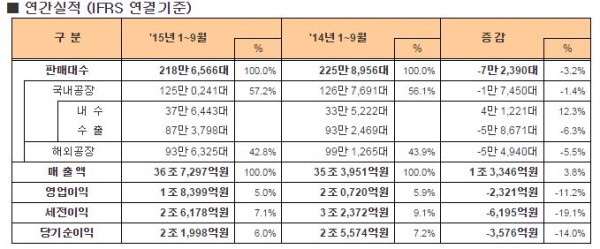 9월까지 국내 공장의 출고판매 수는 지난해 대비 1.4% 감소한 125만 241대였다. 내수 판매는 늘었지만 이종통화 환율 악화에 따라 기타시장 수출 물량이 감소했다.