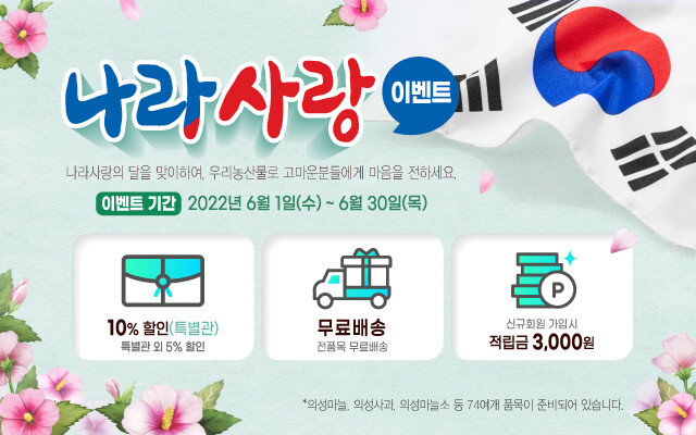 의성장날 쇼핑몰은 이벤트 기간동안 나라사랑 특별관을 마련해 최소 10% 할인행사를 실시하고, 전 품목 5% 할인과 무료배송 및 신규회원에게는 3000원의 적립금을 지급하는 등 다양한 이벤트를 진행한다.
