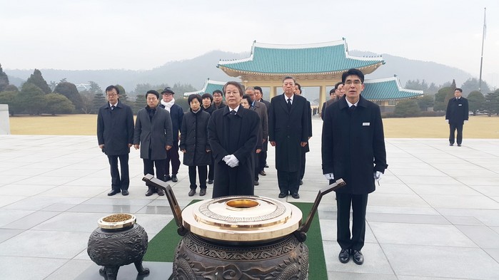▲국민의당 대전시당 신용현 위원장과 대전지역구위원장 등 주요 당직자들은 2일 오전 정유년 새해를 맞아 국립대전현충원을 방문해 분향하고 있다. |