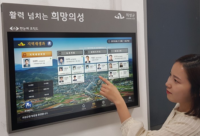‘스마트 직원안내시스템’은 내방객들이 부서를 찾을 때 스마트폰 처럼 화면을 터치해 군청 및 직속기관, 사업소, 읍면 등 의성군 산하 전 공직자를 바로 확인할 수 있는 시스템이다.