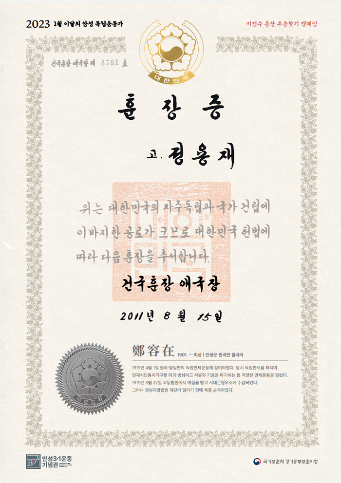 ▲ 1월 안성독립운동가 정용재 선생의 훈장증. 안성시 제공 |