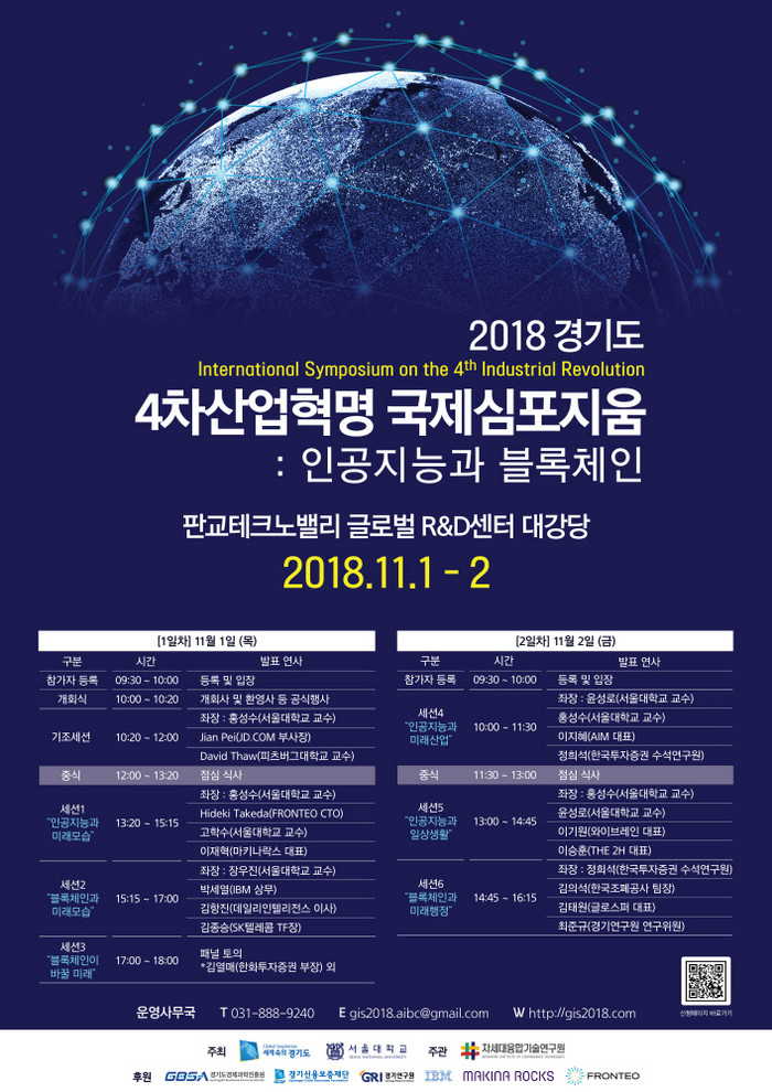 기조세션에서는 중국 굴지의 전자상거래업체 징둥닷컴의 페이 지엔 부사장과 미국 피츠버그 대학의 데이비드 쏘우 교수가 인공지능과 블록체인이 미치는 사회적·산업적 영향을 주제로 기조 강연을 한다.