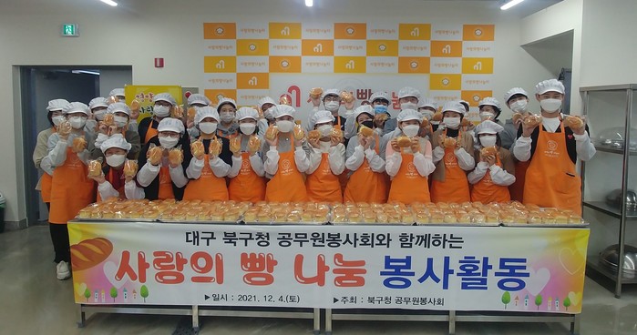 북구청 공무원봉사회는 사랑의 빵 나눔터에서 백신 접종을 완료한 30여 명의 회원들이 참여하여 빵만들기 행사를 실시하고, 이날 만든 약 400개의 빵을 지역 양로원에 전달했다.