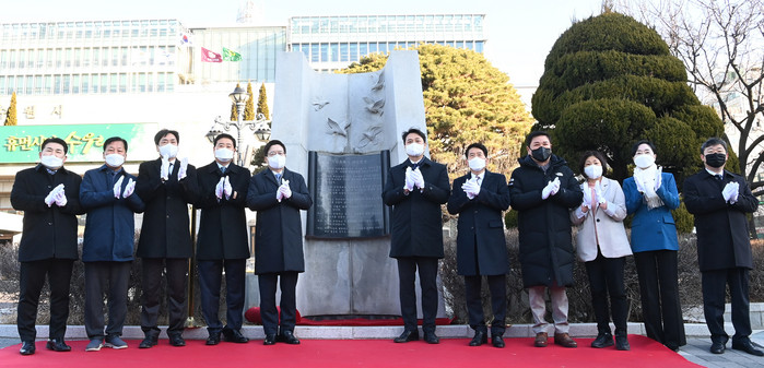 | ▲염태영 시장(왼쪽 5번째) 등이 시민헌장탑 표지석 제막식에서 손뼉을 치고 있다. |