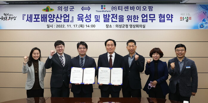[로컬세계=박상진 기자]경북 의성군(군수 김주수)과 ㈜티센바이오팜(대표 한원일)은 11월 17일 군청 영상회의실에서 업무협약을 맺고 의성군 세포배양산업 발전을 위해 상호 협력하기로 했다.