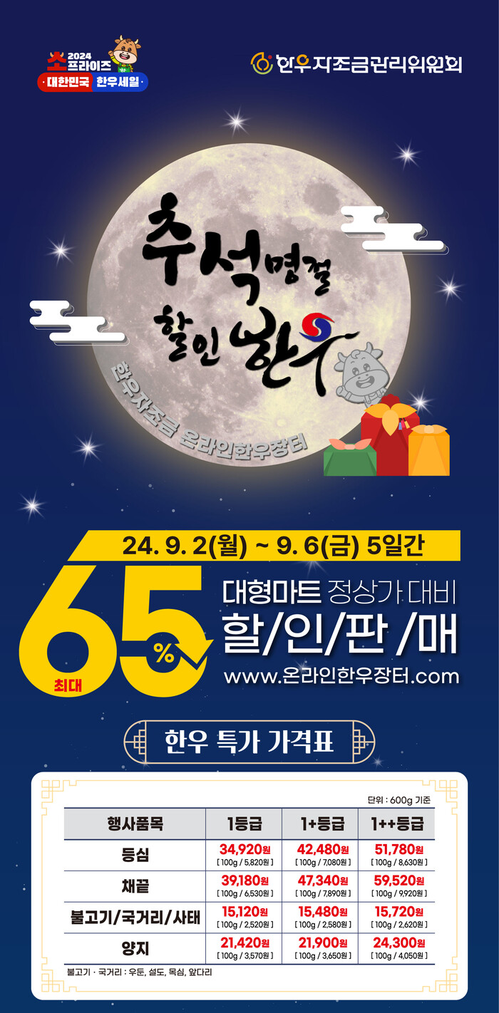 한우자조금관리위원회(위원장 이동활, 이하 한우자조금)가 민족 대명절인 추석을 맞아 온 가족이 함께 한우를 부담 없이 즐기실 수 있도록 오는 9월 2일부터 6일까지 5일간 ‘2024년 추석맞이 온라인 한우장터’를 개최한다고 밝혔다.