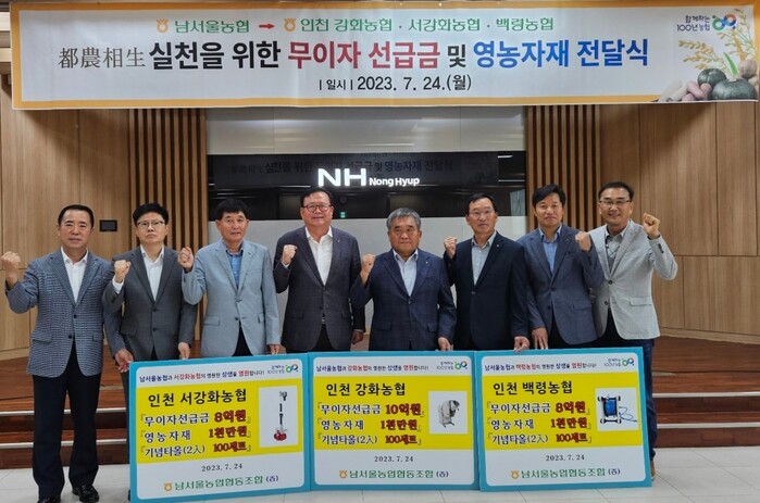이날 전달식에서 남서울농협은 강화농협(조합장 이한훈)에 무이자 선급금 10억원과 1천만원 상당의 무채썰기 기계를, 서강화농협(조합장 황의환)에 무이자선급금 8억원과 1천만원 상당의 농업용지주설치기를, 백령농협(조합장 최형묵)에 무이자선급금 8억원과 1천만원 상당의 농업인지원용 물 호스를 전달하며 총 26억원의 무이자선급금과 3천만원의 맞춤형 영농자재를 전달했다.