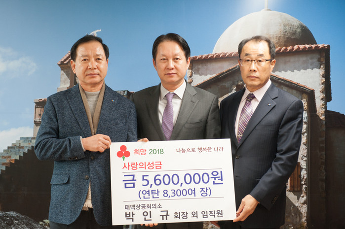 태백상공회의소는 지난 1월 15일부터 2월 6일까지 불우이웃 돕기 성금모금운동을 전개해 560만원의 성금을 모금했다. 모금된 성금은 우리 민족 고유의 명절인 설을 맞아 한파로 힘든 겨울을 보내고 있는 이웃들의 따뜻한 겨울나기를 위해 연탄 약 8300여 장을 구매해 전달될 예정이다.