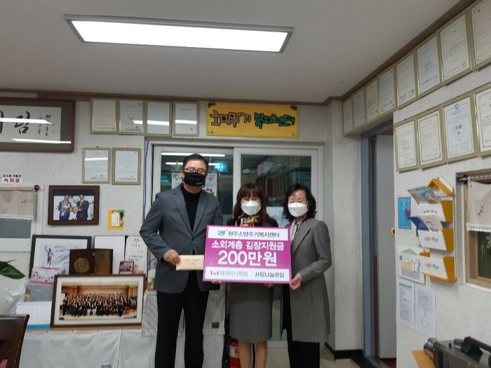 [로컬세계 정연익 기자]사랑나눔모임(회장 황근석)과 미키미니학원(원장 황금영)은 13일 원주시 단계동에 소재한 원주소망주기복지센터(센터장 강기완)에 김장김치 지원금 200만원을 전달했다.