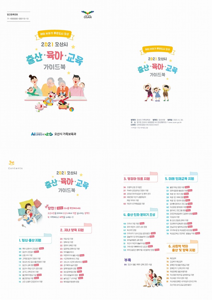 본 가이드북은 ‘임신·출산지원’, ‘자녀 양육지원’, ‘영유아 의료지원’, ‘출산 친화 분위기 조성’, ‘미래 인재교육 지원’, ‘사회적 약자 출산 및 양육 지원’의 총 6개 파트로 구성됐으며, 국가 및 도 지원정책, 여기에 오산시만의 정책을 별도로 표기해 일반 시민들이 한눈에 알아볼 수 있도록 체계적으로 정리했다.
