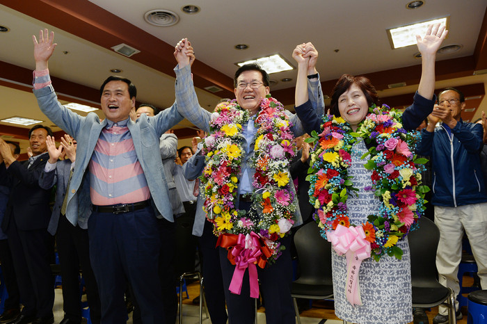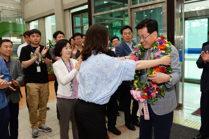 ▲14일, 6‧13지방선거에서 동대문구청장으로 당선된 (현)유덕열 동대문구청장이 직원들의 환호와 꽃목걸이를 전달 받으며 구청으로 복귀하고 있다.(동대문구청 제공) |