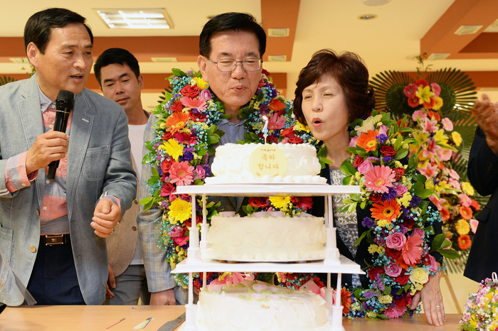 ▲6.13 지방선거 당선자 유덕열구청장과 부인 세명대학교 정승교 교수가 축하케익의 초를 끄고있다 . |
