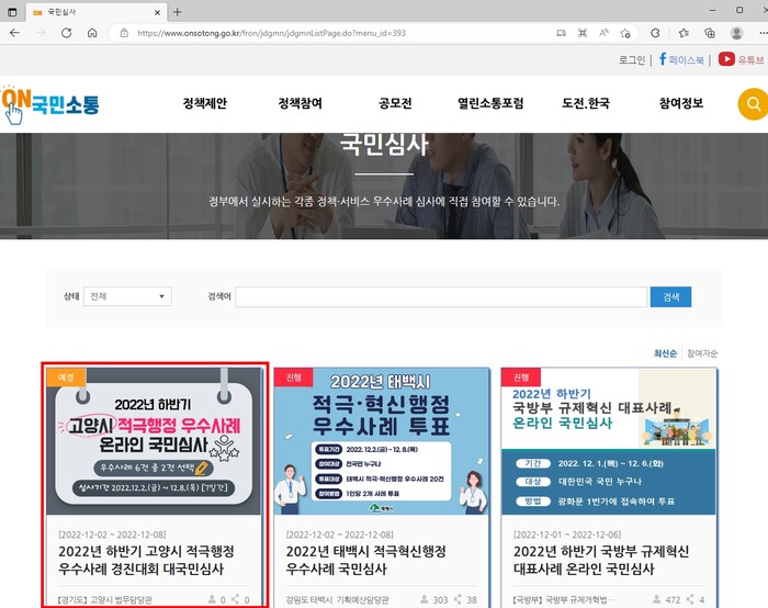 | ▲ 사전 온라인 국민심사는 ‘온국민소통’ 누리집(www.onsotong.go.kr)의 국민심사 코너에서 참여할 수 있다. 고양시 제공 |