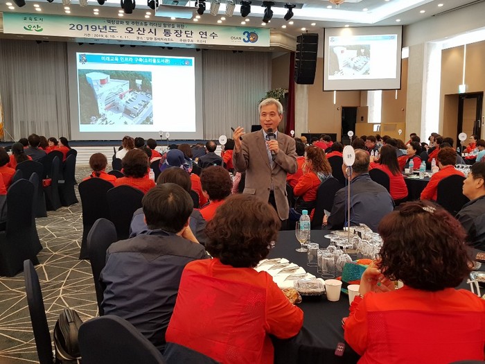 | ▲지난 10일~11일 1박 2일 일정으로 강원도 양양군 쏠비치리조트 등에서 열린 ‘2019년 오산시 통장단 연수’에서 곽상욱 오산시장이 특강을 진행하고 있다.(오산시 제공) |